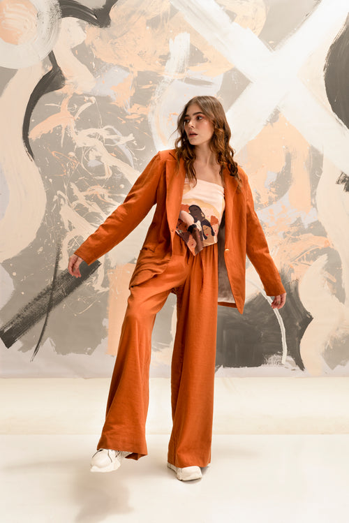 Una colección que traduce la fuerza botánica en siluetas contemporáneas. Construida sobre una paleta de tonos terrosos, verdes, azules y beige, sus estampados evocan formas naturales reinterpretadas a través de una lente gráfica y moderna.
