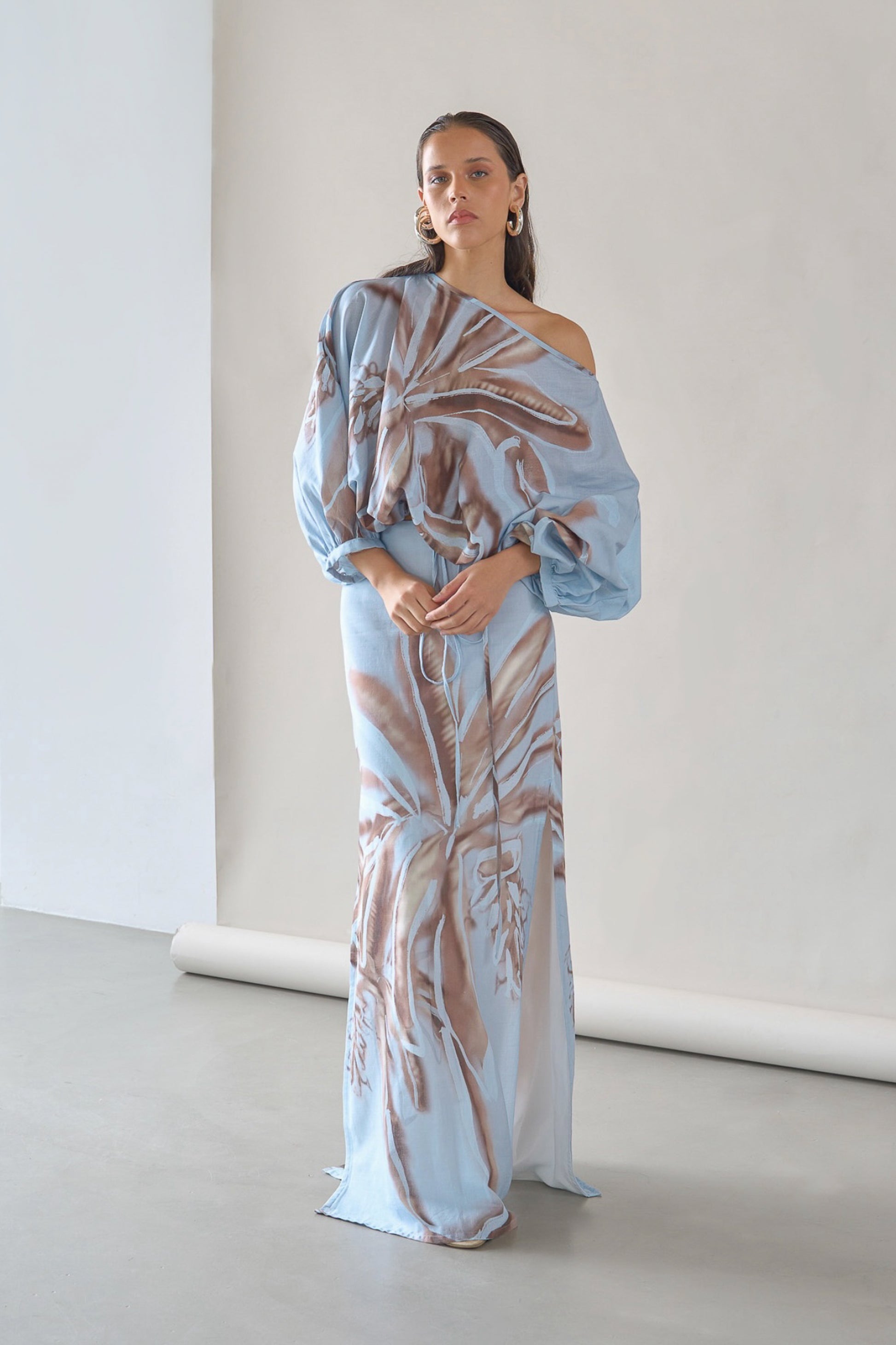 Descripción: Blusa oversized y asimétrica en lino estampado. El detalle fruncido y la manga voluminosa equilibran comodidad y elegancia.